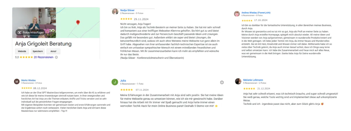 Ich bin Anja Grigoleit, IT- und Business-Beraterin, und unterstütze seit Jahren selbstständige Frauen dabei, ihre Technikängste zu überwinden und ihr Business mit smarten digitalen Lösungen auf das nächste Level zu bringen. Mit meiner Erfahrung zeige ich Dir, wie Du mehr Zeit gewinnst, effizienter arbeitest und Deine Umsätze nachhaltig steigerst – ohne komplizierten Technikstress.